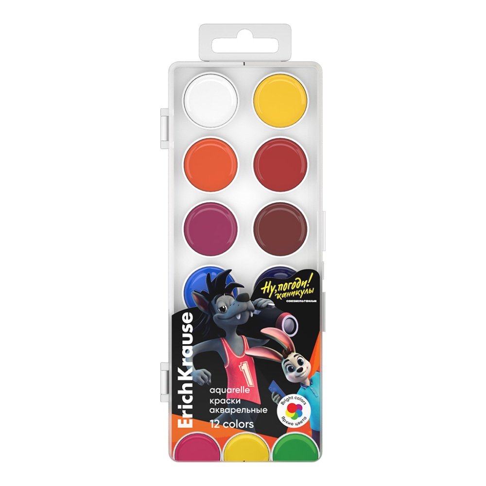 Краски акварельные ErichKrause Ну, Погоди! Каникулы 12 цветов (в пластиковой коробке с европодвесом)