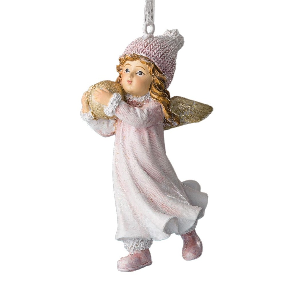 Девочка-ангел выполнена в пастельно-розовом цвете, крылья и снежок окрашены в золотой цвет. Новогодние игрушки в ретро стиле обладают особым шармом. Украшение отличается тонко прорисованными деталями. Групповая упаковка предназначена только для безопасной транспортировки и хранения.