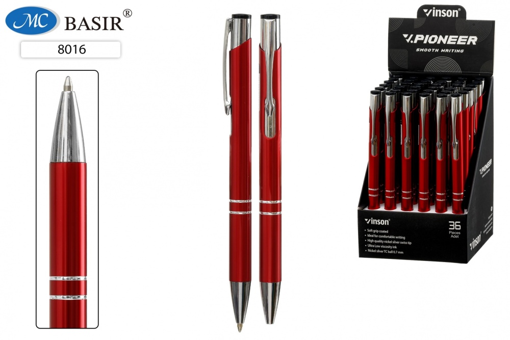 Автоматическая шариковая ручка с чернилами на масляной основе: "VINSON PIONEER"; металлический красный корпус; толщина пишущего узла 0,7 mm, цвет чернил-синий.