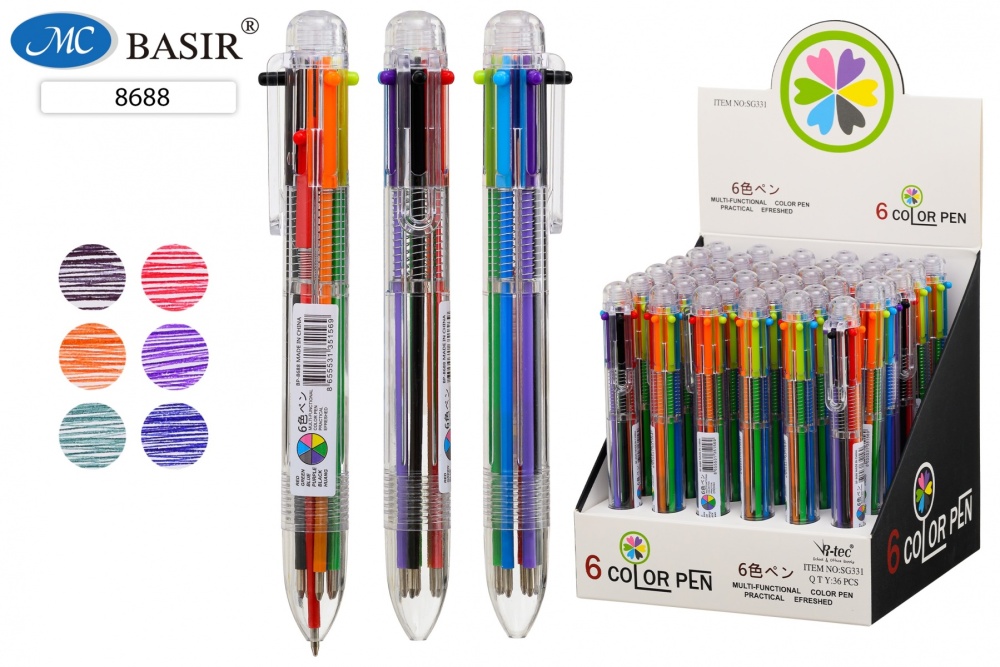 Авторучка 6-ти цветная: прозрачный корпус, 0,7 mm.