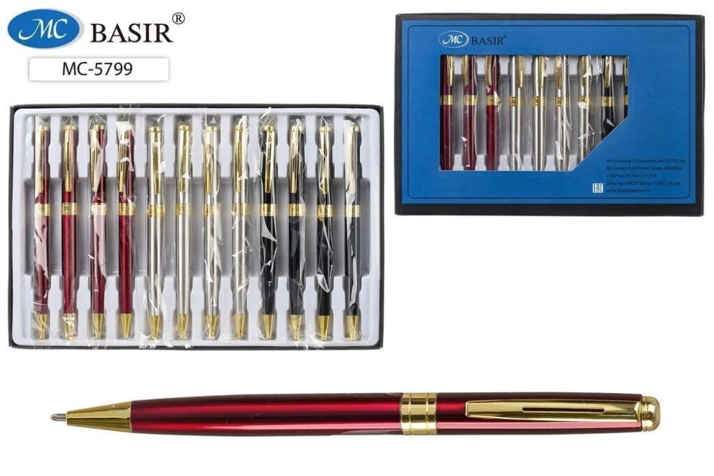 Ручка металлическая - с поворотным механизмом, цветной корпус /ассорти/, клип и наконечник-золотого цвета, цвет чернил - синий.