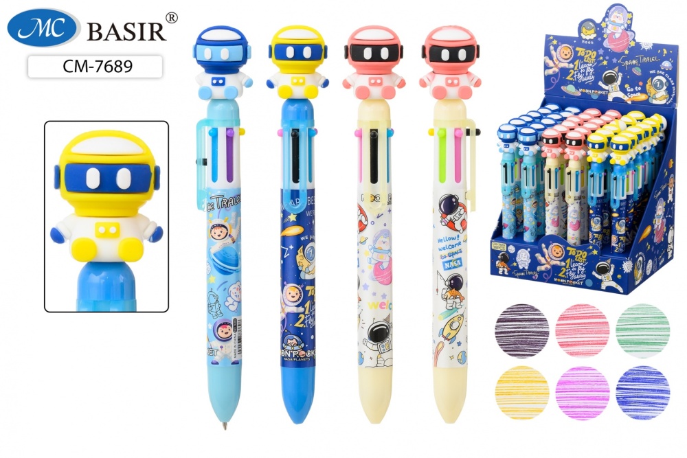 Авторучка 6-ти цветная: детская; "КОСМОНАВТ"; цветной корпус с рисунком .ассорти., прорезиненный наконечник; 0,5 mm.