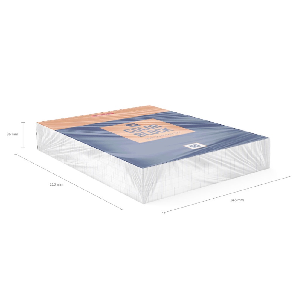 Блокнот формата А5 (148х210 мм). Обложка из высококачественного мелованного картона плотностью 190 г/м2. Жесткая подложка 340 г/м2. В блоке 60 листов в клетку. Бумага офсетная плотностью 60 г/м2. Цвет линовки - синий. Тип скрепления - клей. Блокноты упакованы в термоусадочную пленку по 6 штук.