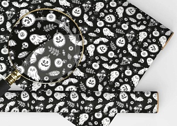 Креативная упаковочная бумага с белыми тыквами, привидениями, пауками и летучими мышами на черном фоне придаст оригинальности любому презенту. Рисунок нанесен с одной стороны. Бумагу можно использовать для оформления конфет, букетов, подарочных композиций и наборов. Благодаря оптимальному размеру 70х100 см получится завернуть один большой подарок или несколько маленьких. Свежий дизайн порадует взрослого или ребенка на день рождения, свадьбу или другой праздник. Часто для корпоративных подарков необходим единый стиль оформления, поэтому приобретается упаковочная бумага оптом. Также красочная обертка послужит хорошим материалом для поделок.