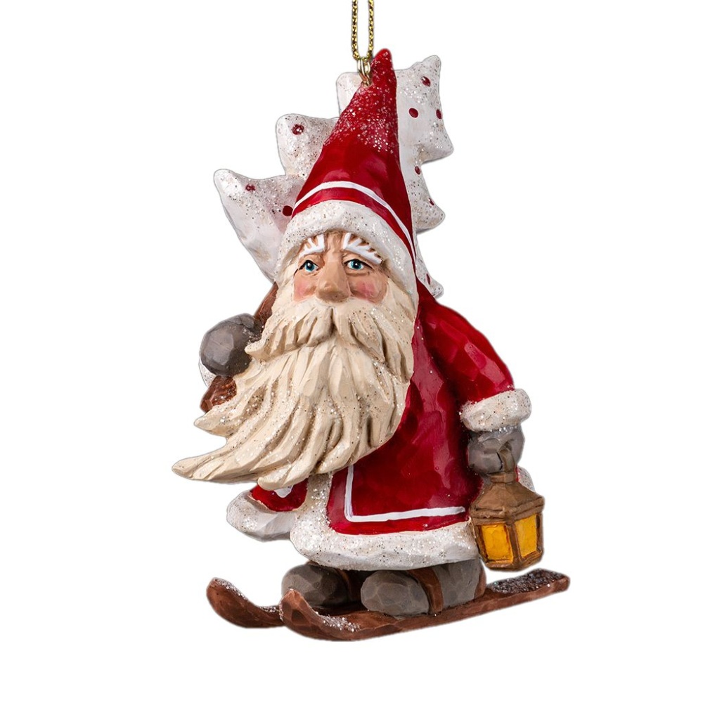 Бородатый Санта на снегоступах несет белую елочку на праздник. Костюм персонажа выполнен в классическом новогоднем сочетании красного и белого цветов. Детали украшения тонко прорисованы. Изделие является относительно тяжелым, предпочтительно использование на искусственной елке. Групповая упаковка предназначена только для безопасной транспортировки и хранения.