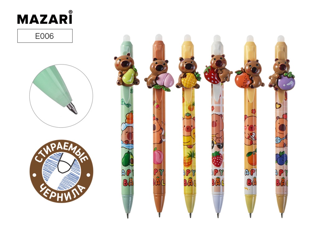 Ручка гелевая автоматич, стираемая. CAPYBARA. 0.5мм, термочувств.чернила, цв.пластик.корпус, 6 дизайнов. Синяя