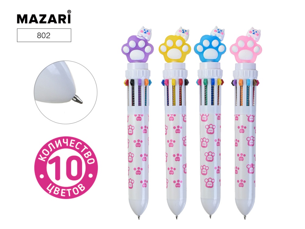 Ручка шариковая автоматич. CAT PAW, 10-цветная. 0.7мм, цв.пластик.корпус 4 дизайна