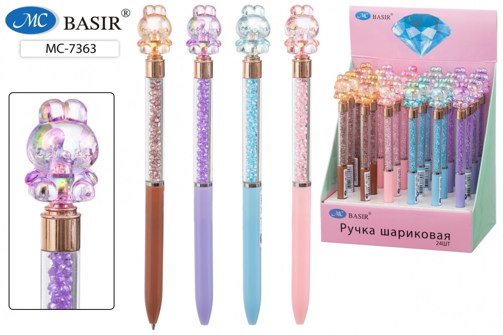 Ручка шариковая с поворотным механизмом; наконечник "ЗАЙЧИК"; корпус цветной.прозрачн. с наполнителем-стразы, синяя.