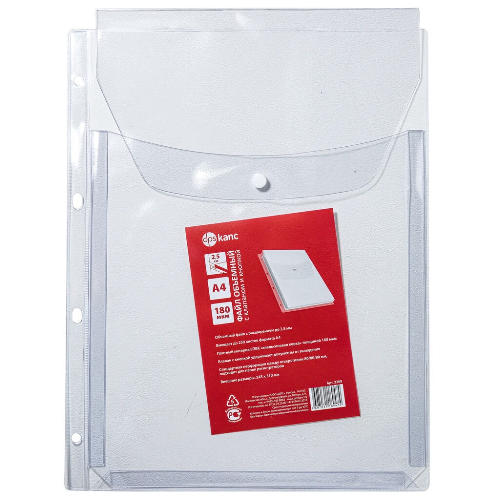 Прозрачный файл-вкладыш для объемных документов А4, с 4 отверстиями и клапаном на кнопке. Перфорация дает возможность подшивать в любые папки. Прочный файл из плотного ПВХ надежно защищает документы от загрязнения и механического повреждения. Клапан на кнопке не дает документам рассыпаться и делает его более мобильным. - Размер - 243 х 310 мм. Материал - ПВХ. - Плотность - 180 мкм, фактура "апельсин" - Клапан на кнопке - горизонтальный - Перфорация - вертикальная, 4 отверстия, размеры между отверстиями 80/80/80 мм. Расширение - 25 мм, 250 листов