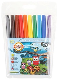 Фломастеры Koh-i-Noor Совы 10 цветов для рисования на бумаге и картоне - это яркие фломастеры на водной основе, поэтому они хорошо смываются с рук и отстирываются с одежды. Круглый корпус с треугольной зоной захвата удобен для детской руки, вентилируемый колпачок обеспечивает безопасность при случайном проглатывании. Толщина линии при письме 1-2 мм, максимальная длина письма 600 метров. Фломастеры имеют увеличенный срок годности - 5 лет. Рекомендованы детям старше трех лет. Упакованы в пакет их ПВХ с подвесом, размер 195x128x11 мм.