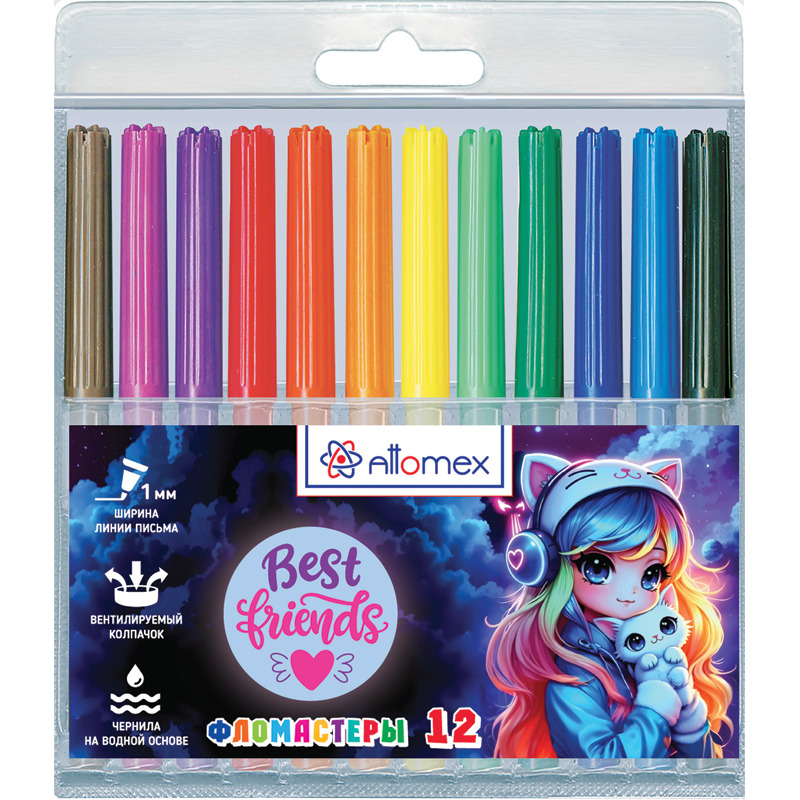 Фломастеры "Attomex. Best Friends" 12 цветов с вентилируемым колпачком, в пластиковом блистере