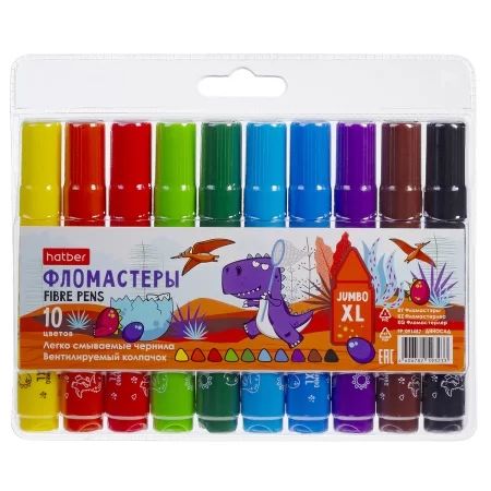 Фломастеры Hatber JUMBO-XL ДИНОСАД 10 цветов с одним из самых толстых корпусов в своём классе - диаметром 19мм.Утолщённая форма корпуса, позволяет ребёнку удобно держать фломастер в руке. Корпус из полипропилена устойчив к разлому, - безопасен при попытке сломать. Чернила фломастеры изготовлены на водной основе, не имеет запаха, безопасны, легко смываются с рук и одежды с помощью воды и мыла. Штрихи и линии не проступают на обратную сторону листа. Толстый наконечник, диаметром 6мм, выдерживает сильный нажим и не проваливается внутрь корпуса.Колпачок имеет специальные прорези для вентиляции, которые способствуют прохождению воздуха при случайном попадании в дыхательные пути ребёнка. При этом колпачок плотно закрывается, обеспечивая долгий срок службы фломастера.