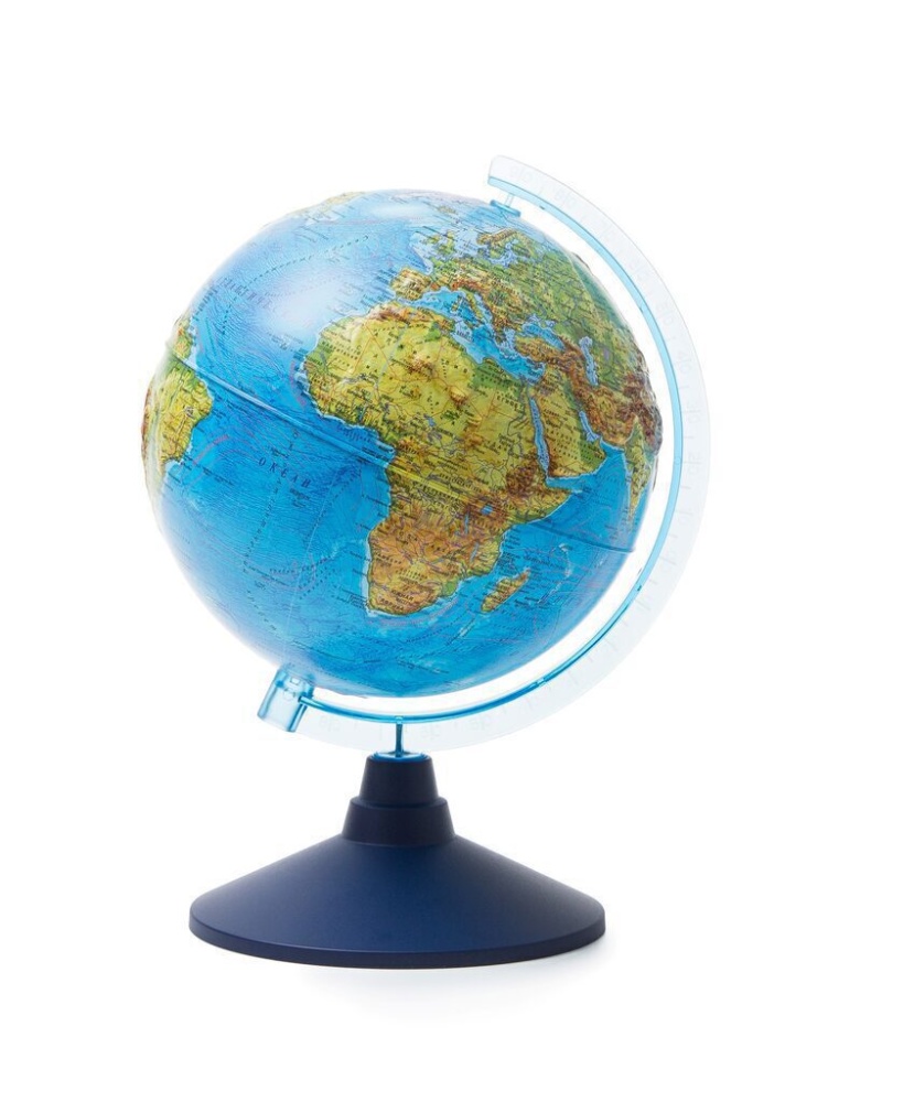 Дети нуждаются не только в современных гаджетах, но и в классических учебных пособиях, таких как настольный глобус с физической картой мира. Только он поможет наглядно понять малышу географическое устройство нашего мира, расположение морей и континентов относительно друг друга, богатство и разнообразие рельефа планеты Земля. Глобус изготовлен из высококачественных нетоксичных материалов по современным технологиям. Пластиковые сфера и подставка устойчивы к случайным повреждениям. Кроме того, устойчивая подставка страхует глобус от нечаянного падения. Диаметр сферы 21 см. Это оптимальный вариант для дошкольников и учащихся начальной школы. При таком размере достаточно подробно отображена карта Мира, при этом глобус не занимает много места, и его легко держать ребенку в руках. Как уже упоминалось, карта максимально подробная для данного диаметра. На ней отображены все значимые географические объекты: материки, океаны и моря с указанием течений, горные хребты, плоскогорья и равнины, реки, озера. Все наименования