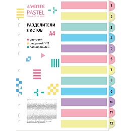 Разделитель листов "deVENTE. Pastel" A4 (223x296 мм) полипропилен 140 мкм, цифровой, цветовой, 12 шт, индивидуальная упаковка