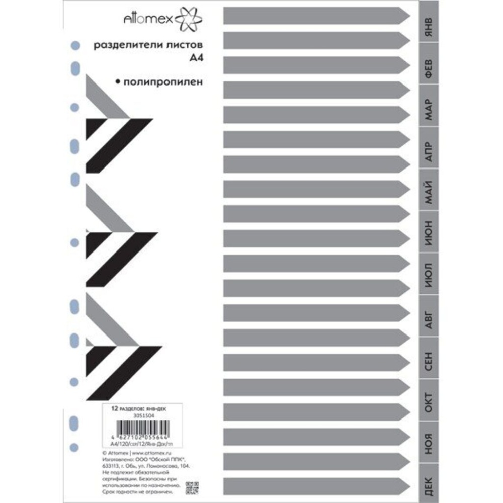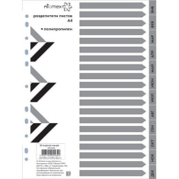 Разделитель листов "Attomex" пластиковый А4 по месяцам Янв-Дек. Обеспечивает сохранность листов. Для подшивки бумаг в архивные папки без перфорирования дыроколом. Стандартная перфорация совместима с любыми видами архивных папок.