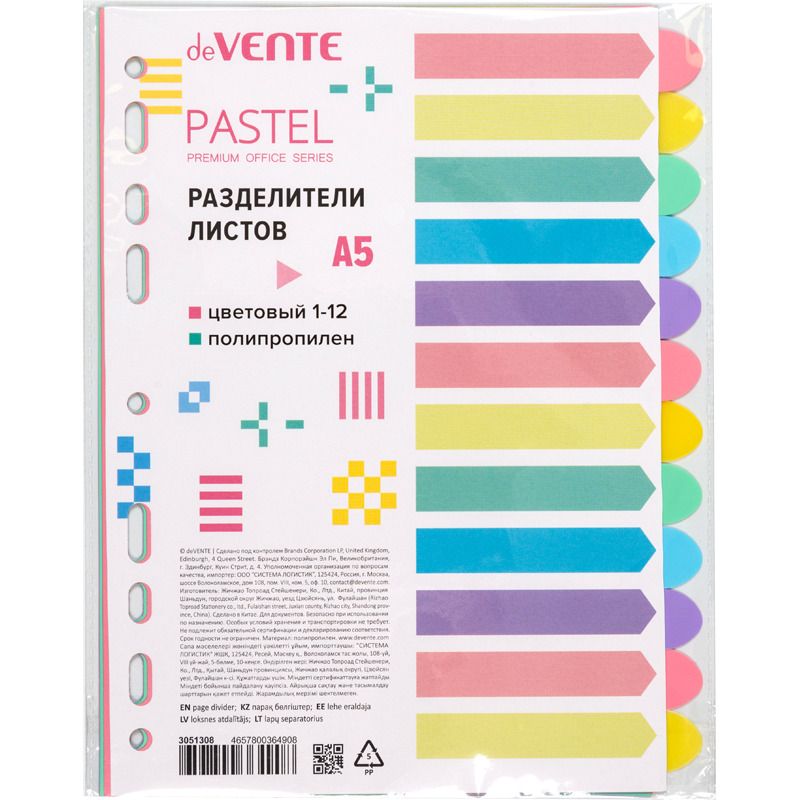 Разделитель листов "deVENTE. Pastel" A5 (175x210 мм) полипропилен 140 мкм, цветовой, 12 шт, индивидуальная упаковка