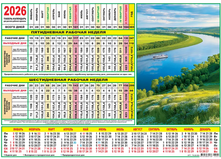 Табель-календарь 2026 г. А4 для расчёта рабочего времени.а ассортименте