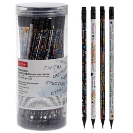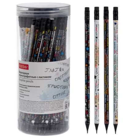 Чернографитный карандаш c рисунком и заточкой имеет круглую форму. Дополнен ластиком и является идеальным инструментом для письма, рисования и черчения. Прочный неломающийся грифель диаметром 2 мм и твердостью НВ. Упаковка: пластиковая туба на 72 штуки.