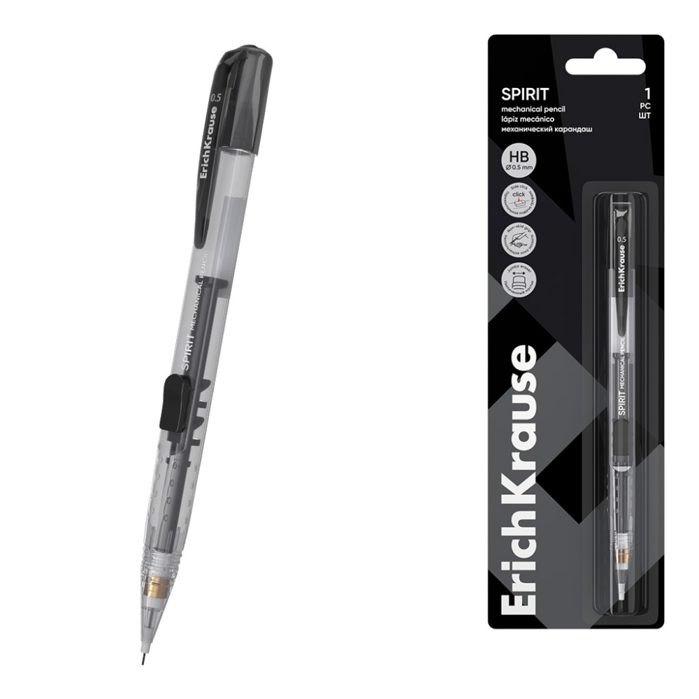 Механический карандаш с горизонтальной подачей грифеля. Нескользящая зона захвата. Оснащен ластиком, увеличенного размера, закрывающимся колпачком и удобной клипсой. Твердость ТМ. Диаметр грифеля - 0.5 мм.