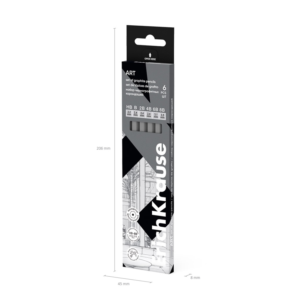 Классические шестигранные чернографитные карандаши различной степени твердости. Рекомендуются для выполнения скетчей, графических зарисовок и художественных работ любой сложности. Грифель не царапает бумагу и не крошится. Насыщенность каждого графитового оттенка зависит от степени его жёсткости. Специальная пропитка древесины и сплошная проклейка грифеля обеспечивают высокую ударопрочность. Мягкая древесина и идеальная центровка грифеля гарантируют легкую заточку с экономным расходом карандаша.