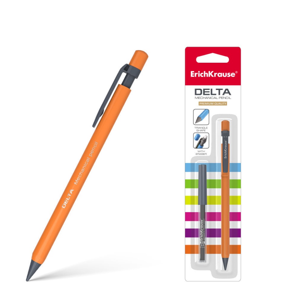 Механический карандаш эргономичной треугольной формы с ластиком, закрывающимся колпачком и удобным клипом. Корпус выполнен в ярких неоновых цветах. Твердость HB. Диаметр грифеля - 0.5 мм. Модель Delta стала абсолютным бестселлером в ассортименте механических карандашей ErichKrause более чем в пятидесяти странах мира.