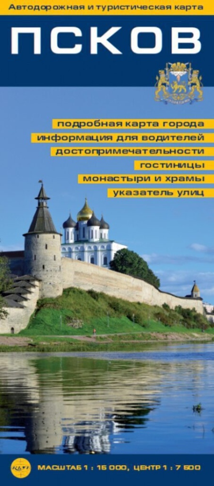 На карте подробно показаны: улицы и здания с номерами; одностороннее движение, объекты автосервиса, все достопримечательности, гостиницы, торговые центры. Дополнительно: указатель улиц г. Пскова, справочная информация о музеях, гостиницах и пансионатах. год 2019 Формат: 100х225 мм. Формат разворота: 450х690 мм. Масштаб: 1:15 000, центр - 1 :7 500