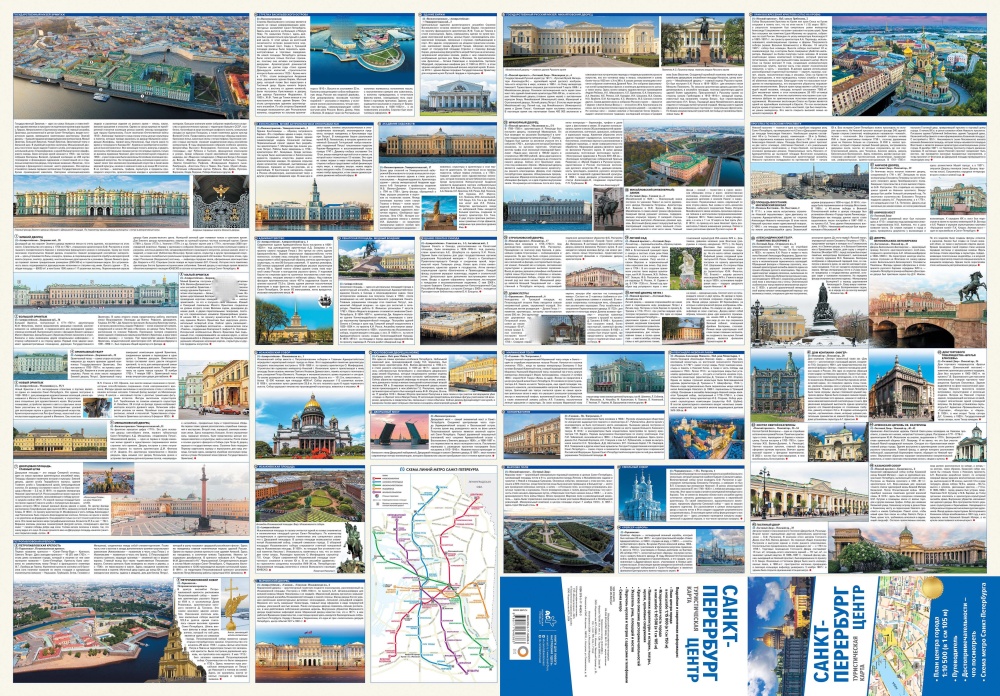 На одной стороне листа карта Санкт-Петербурга, на другой стороне краткий путеводитель с описанием основных музеев, театров, выставочных и концертных залов города. На карте наглядно представлена центральная, наиболее интересная в историческом, архитектурном и культурном смысле, часть Санкт-Петербурга. Цветом выделены основные транспортные магистрали города, некоторые интересные туристические объекты, выражаемые в масштабе карты, вокзалы, парки, водные объекты. Театры, музеи и пр. показаны внемасштабными знаками. Некоторые известные здания и сооружения даны рисунками. Карта снабжена подробным указателем улиц и мостов, а также музеев, театров и других учреждений культуры. Основная карта дополнена схемой скоростного транспорта.