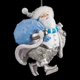 Дед Мороз в необычном серебряном одеянии катается на коньках. Шапка оторочена белым мехом. Большой мешок с подарками декорирован орнаментом из елочек. Сочетание голубого и серебряного цвета наполняет дом радостным предвкушением праздника и волшебства. Украшение является относительно тяжелым, предпочтительно использование на искусственной елке. Групповая упаковка предназначена только для безопасной транспортировки и хранения.