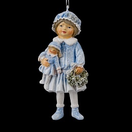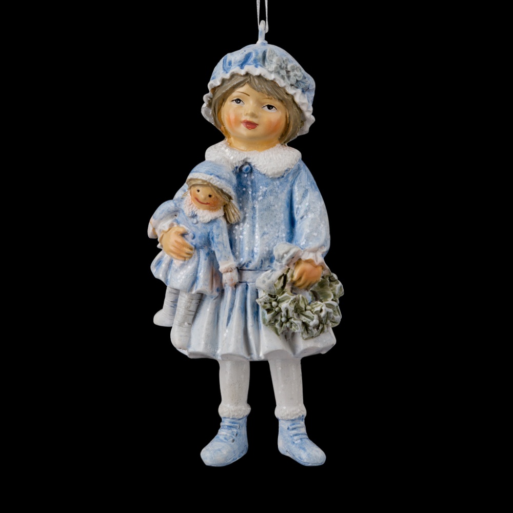 Милая девочка с куклой и рождественским венком станет отличным дополнением к новогодней елке. Елочные игрушки в ретро стиле излучают особую теплоту. Украшение отличается нежным голубым цветом. Прозрачные блестки создают эффект хлопьев снега. Детали тонко прорисованы. Изделие является относительно тяжелым, предпочтительно использование на искусственной елке. Групповая упаковка предназначена только для безопасной транспортировки и хранения.