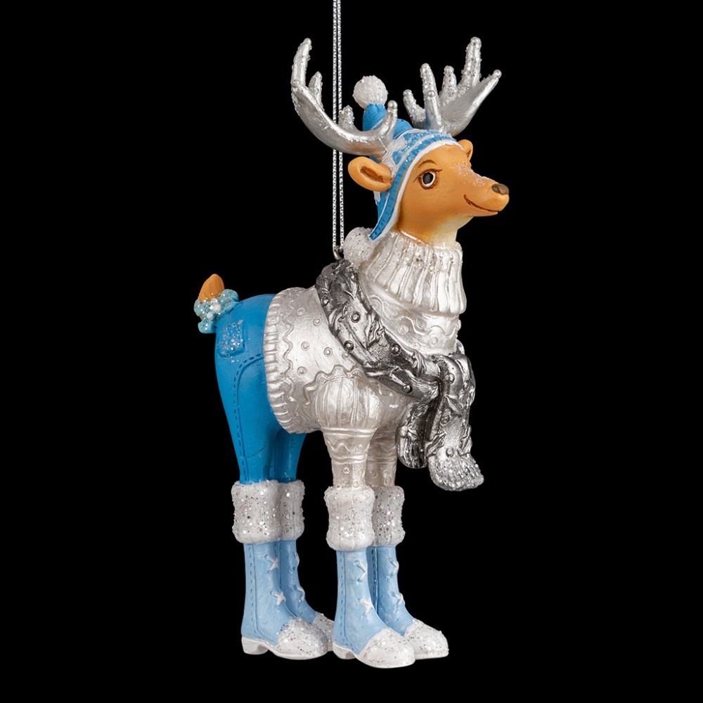 Лосяша одета в теплый зимний костюм с ботиночками. Сверкающие краски и сочетание голубого и серебряного цвета наполнят дом радостным предвкушением праздника и волшебства. Украшение отличается тонко прорисованными деталями. Изделие является относительно тяжелым, предпочтительно использование на искусственной елке. Групповая упаковка предназначена только для безопасной транспортировки и хранения.