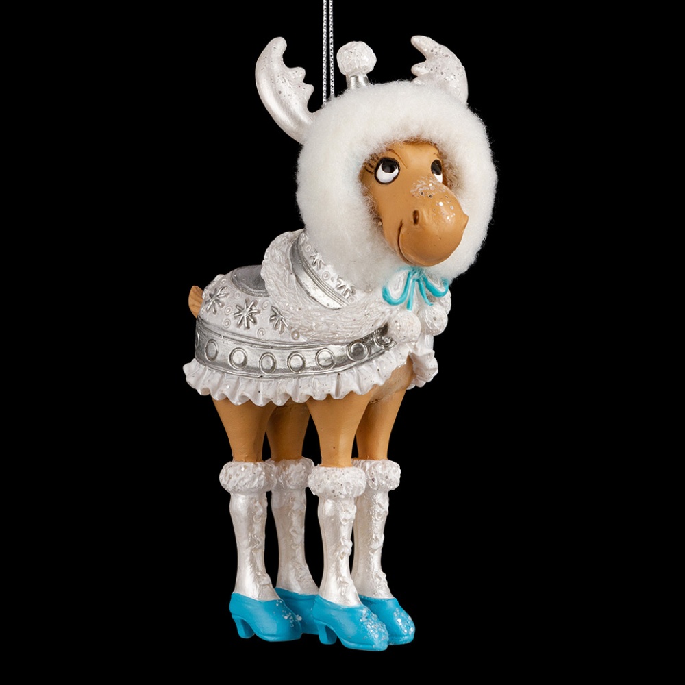Лосяша одета в элегантную серебряную шубку и туфельки с теплыми гетрами. Капюшон декорирован белым мехом. Сочетание голубого и серебряного цвета наполняет дом радостным предвкушением праздника и волшебства. Украшение отличается тонко прорисованными деталями. Изделие является относительно тяжелым, предпочтительно использование на искусственной елке. Групповая упаковка предназначена только для безопасной транспортировки и хранения.