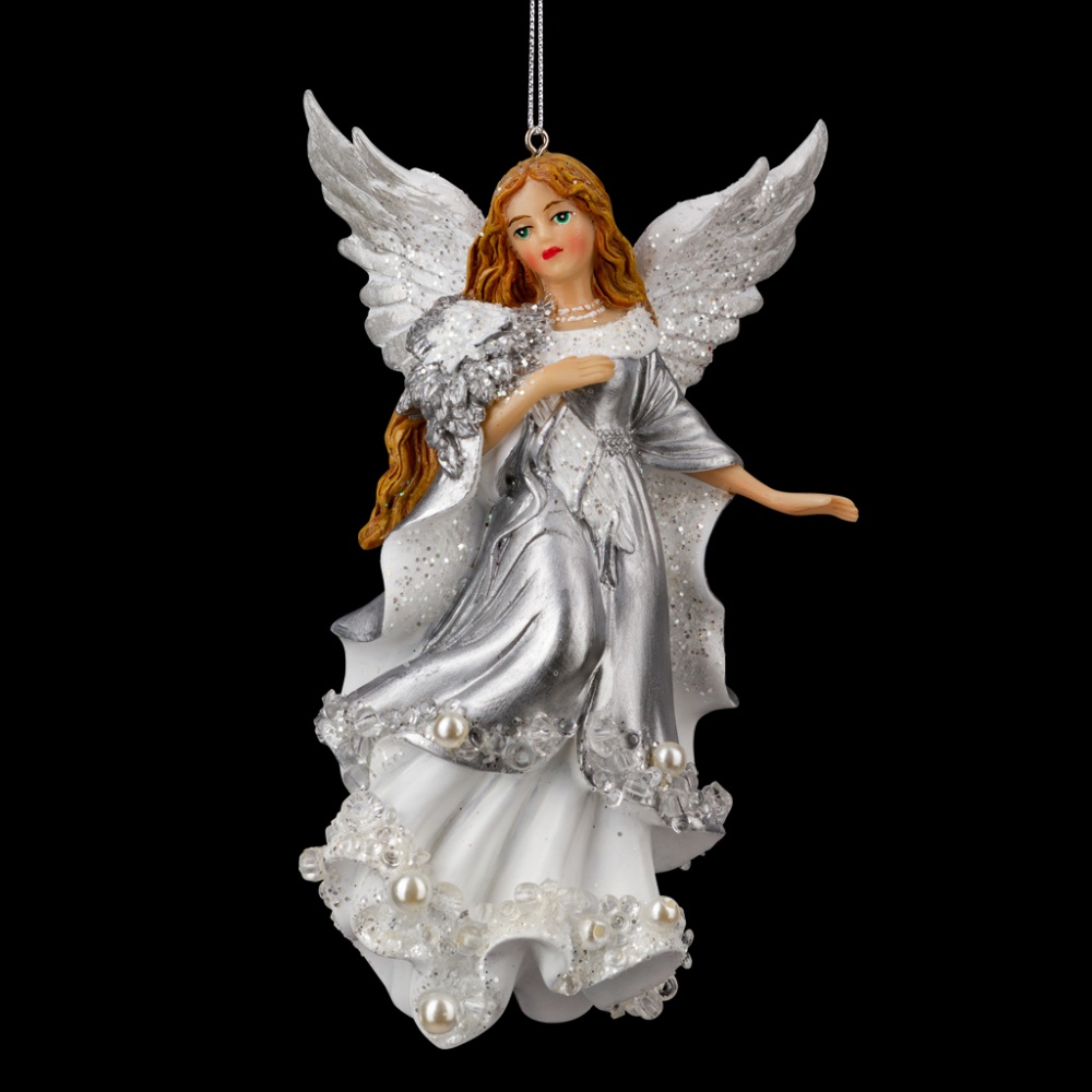 Ангел восхищает тонко прорисованными деталями. Крылья и костюм покрыты сверкающей серебряной краской и блестками. Подол одеяния декорирован хрустальными и жемчужными бусинами, что придает украшению эксклюзивность. Изделие является относительно тяжелым, предпочтительно использование на искусственной елке. Групповая упаковка предназначена только для безопасной транспортировки и хранения.