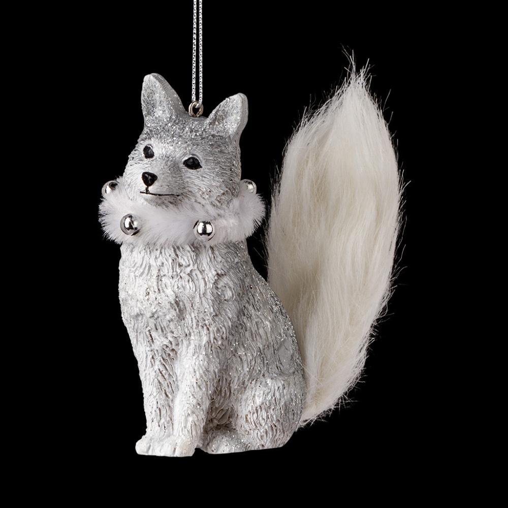 Лиса с пышным меховым хвостом выглядит очень нарядно и торжесртвенно. Украшение восхищает переходом от белого к серебряному цвету. Шея лисички декорирована пушистым белым венком с миниатюрными шариками серебряного цвета. Детали тонко прорисованы. Групповая упаковка предназначена только для безопасной транспортировки и хранения.
