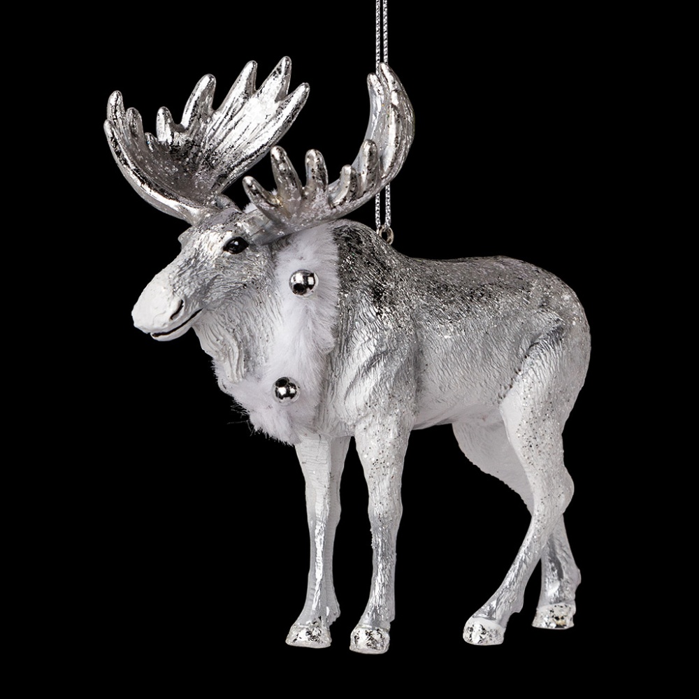 Роскошный лось восхищает переходом от белого к серебряному цвету, его рога, спина и копыта сверкают при свете гирлянд. Шея декорирована пушистым белым венком с миниатюрными шариками серебряного цвета. Детали украшения тонко прорисованы. Изделие является относительно тяжелым, предпочтительно использование на искусственной елке. Групповая упаковка предназначена только для безопасной транспортировки и хранения.