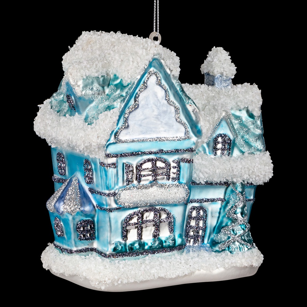Крупный объемный домик завораживает сверкающим сочетанием серебра и матового голубого цвета. Такая комбинация наполняет дом радостным предвкушением праздника и волшебства. Крупные блестки-хлопья на крыше и вокруг дома создают эффект заснеженности. Украшение выполнено из стекла высокого качества. Изделие является относительно тяжелым, предпочтительно использование на искусственной елке. На дне игрушки есть технологическое отверстие, связанное с процессом производства, при котором стеклянная игрушка выдувалась вручную. Групповая упаковка предназначена только для безопасной транспортировки и хранения.