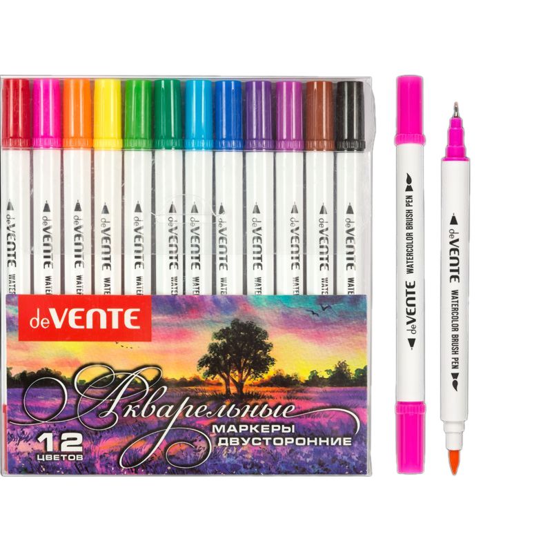 Маркеры акварельные "deVENTE" 12 цветов имеют высокопигментированные чернила со специальным акварельным эффектом. Подходят для художественных и декоративных работ, двусторонние: кистевидный наконечник из фетра для плавных мягких линий и закрашивания элементов рисунка, пулевидный наконечник в металлической обойме для точечной прорисовки деталей, обводки контура, четких линий и штрихов Маркеры акварельные "deVENTE" двусторонние (кистевидный до 2 мм/пулевидный в металлической обойме 0,4 мм), круглый корпус, акварельные чернила на водной основе, в пластиковой коробке