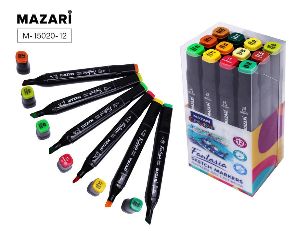Набор маркеров для скетчинга двусторонние фирмы Mazari Fantasia подходят для самых требовательных художников, иллюстраторов, дизайнеров и любителей скетчинга. Приятный на ощупь эргономический корпус позволяет держать контроль при рисовании точных и сложных скетчей. Два пера удобны для комбинированной работы. Тонкое для проработки деталей и широкое плоское для закрашивания больших фрагментов. Чернила на спиртовой основе нетоксичны и не портят поверхность бумаги в отличие от маркеров на водной основе. Скетчи маркерами Fantasia быстро высыхают на бумаге и становятся водостойкими, бескислотными. Маркеры Fantasia подходят для использования на бумаге, картоне, фотографиях, ксерокопиях, пластике, дереве, ткани, холсте.