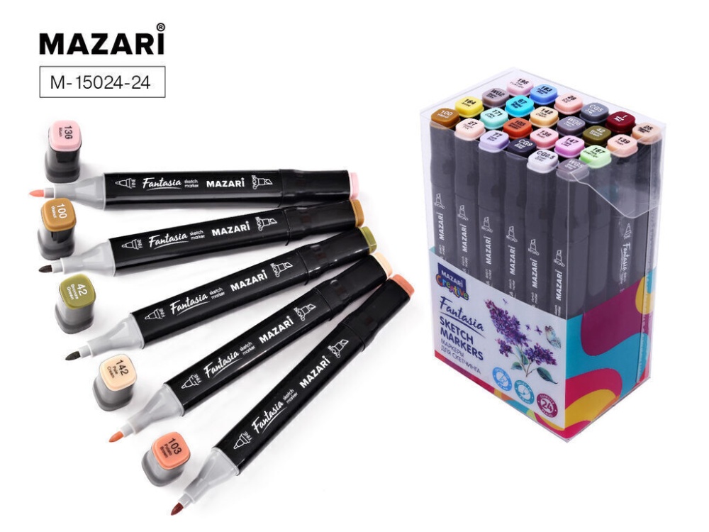 Набор маркеров для скетчинга двусторонние фирмы Mazari Fantasia подходят для самых требовательных художников, иллюстраторов, дизайнеров и любителей скетчинга. Приятный на ощупь эргономический корпус позволяет держать контроль при рисовании точных и сложных скетчей. Два пера удобны для комбинированной работы. Тонкое для проработки деталей и широкое плоское для закрашивания больших фрагментов. Чернила на спиртовой основе нетоксичны и не портят поверхность бумаги в отличие от маркеров на водной основе. Скетчи маркерами Fantasia быстро высыхают на бумаге и становятся водостойкими, бескислотными. Маркеры Fantasia подходят для использования на бумаге, картоне, фотографиях, ксерокопиях, пластике, дереве, ткани, холсте.