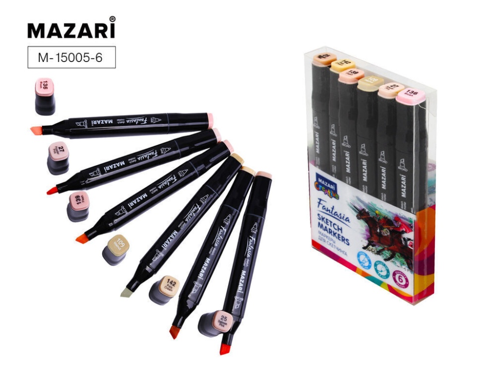 Набор маркеров для скетчинга двусторонние FANTASIA, 6цв., Skin colors (телесные цвета), пулевид./клиновид. наконечники, пиш.узлы 3.0-6.2мм, ПВХ- упаковка