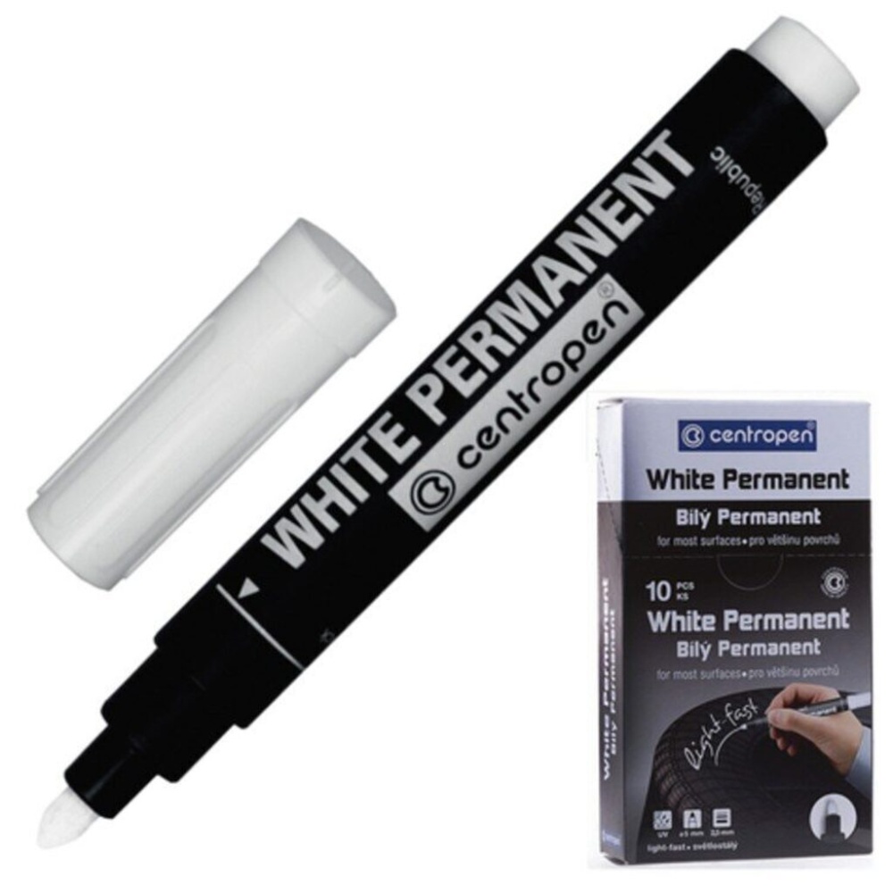 Перманентный универсальный маркер пишет на большинстве поверхностей, после засыхания устойчивый к воде, стиранию, атмосферным воздействиям. Белые светостойкие чернила на водной основе. Линия письма - 2,5 мм.