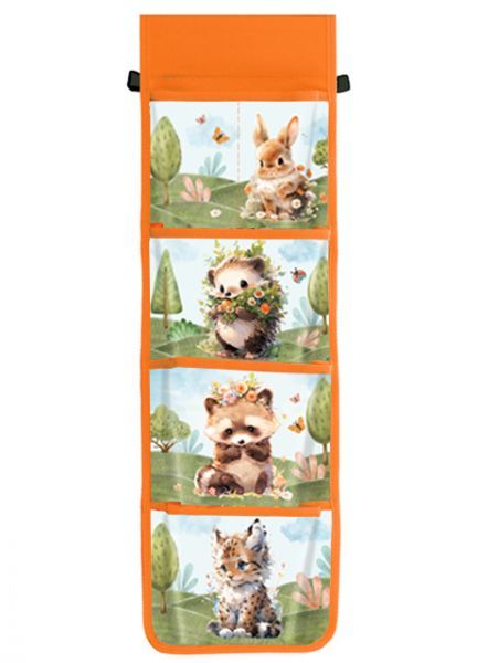 Детский подвесной органайзер шириной 24 см и высотой 80 см предназначен для размещения на дверце шкафчика в детском саду. Имеет 5 карманов-3 объемных и верхний, разделенный пополам.