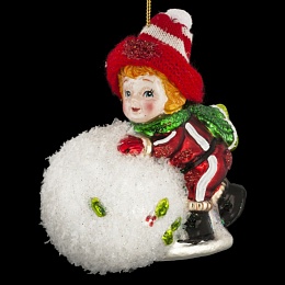 Малыш в теплой шапке лепит катает большой снежок. Его шапка сделана из настоящей шерсти. Украшение выполнено из стекла высокого качества и отличается яркими цветами. Снежок покрыт искусственным снегом и перламутровыми блестками. Групповая упаковка предназначена только для безопасной транспортировки и хранения.