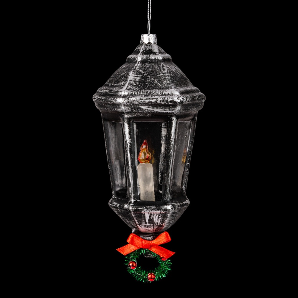 Крупная лампа уличного фонаря выполнена из стекла высокого качества. Внутри находится декоративная свечка, внешняя часть декорирована рождественским венком из мишуры и шелковым бантиком. Елочная игрушка в стиле ретро создаст дома уютную атмосферу, такие украшения могут передаваться из поколение в поколение. Изделие отличается крупным размером и является относительно тяжелым, предпочтительно использование на искусственной елке. Групповая упаковка предназначена только для безопасной транспортировки и хранения.