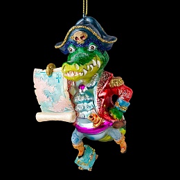 Билли Бонс - один из главных героев произведения "Остров Сокровищ", обладатель карты с сокровищами. В своем сундучке Билли хранил деньги и документы. Пират в образе забавного крокодила станет особым украшением на праздничной елке. Туловище персонажа выполнено из стекла высокого качества. Голова, лапы, карта и сундук сделаны из полирезины, что позволяет максимально точно передать детализацию персонажа. Изделие является относительно тяжелым, предпочтительно использование на искусственной елке. Групповая упаковка предназначена только для безопасной транспортировки и хранения.