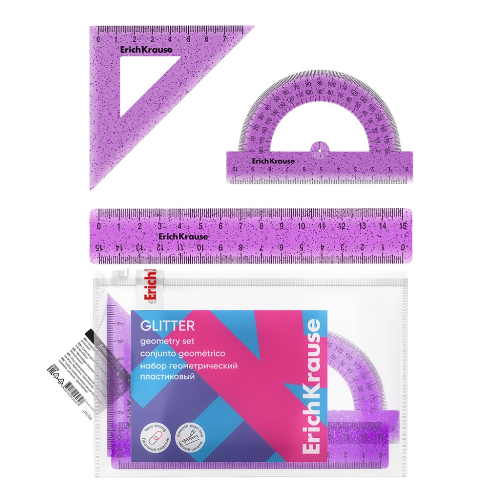 Набор геометрический малый пластиковый ErichKrause Glitter, (линейка, угольник, транспортир), zip-па