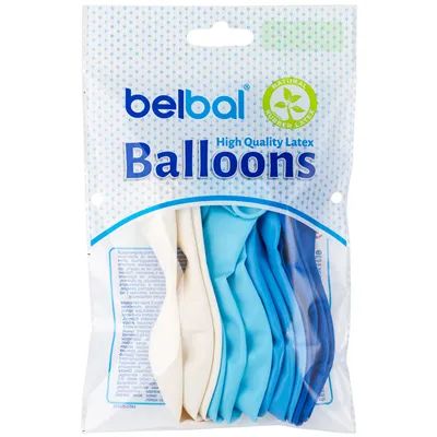 Шарики продаются в не надутом виде. В пакете 12 шаров, ассорти из четырех цветов: белый, светло-голубой, небесно-голубой и синий. Тип шара пастель. Цвет шара имеет матовый оттенок. Размер шара в надутом виде 35см. Шары Belbal имеют сертификат Intertek Tickmark, который гарантирует их безопасность. Изготавливаются из экологически безопасного 100%-ного натурального латекса. В окружающей среде разлагаются на безопасные компоненты примерно с той-же скоростью, как обычные листья деревьев. После использования шар рекомендуется лопнуть и утилизировать как бытовой отход.