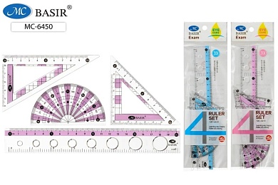 Линейки. Набор 4 шт, прозр.пластик с цв.вставками: 2 треугольника, транспортир, линейка с трафаретом 20 см.