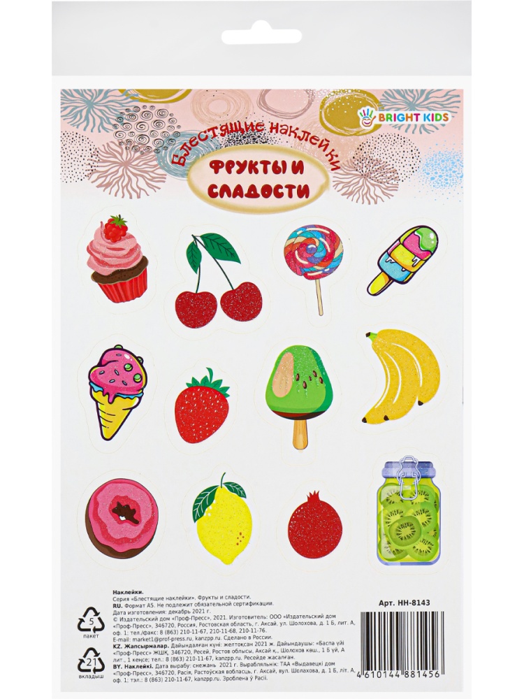 Набор наклеек 150*225мм, 1 л. "Блестящие наклейки. Фрукты и сладости"