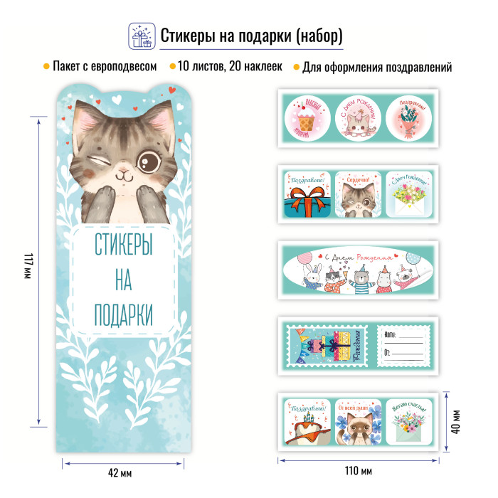Набор поздравительных наклеек (20 шт. на 10 листах): Обложка картон. Наклейки самоклеющаяся бумага, фигурная вырубка. Размер листа 110х40 мм. Упаковка: в пакете с европодвесом.