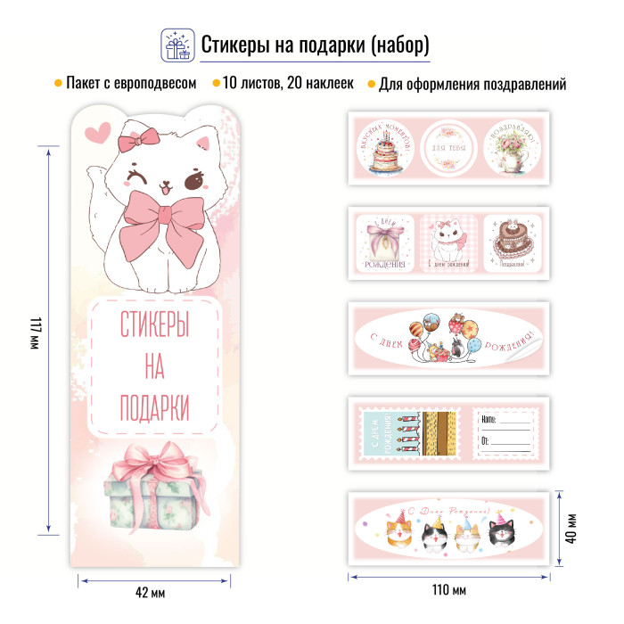 Набор поздравительных наклеек (20 шт. на 10 листах): Обложка картон. Наклейки самоклеющаяся бумага, фигурная вырубка. Размер листа 110х40 мм. Упаковка: в пакете с европодвесом.